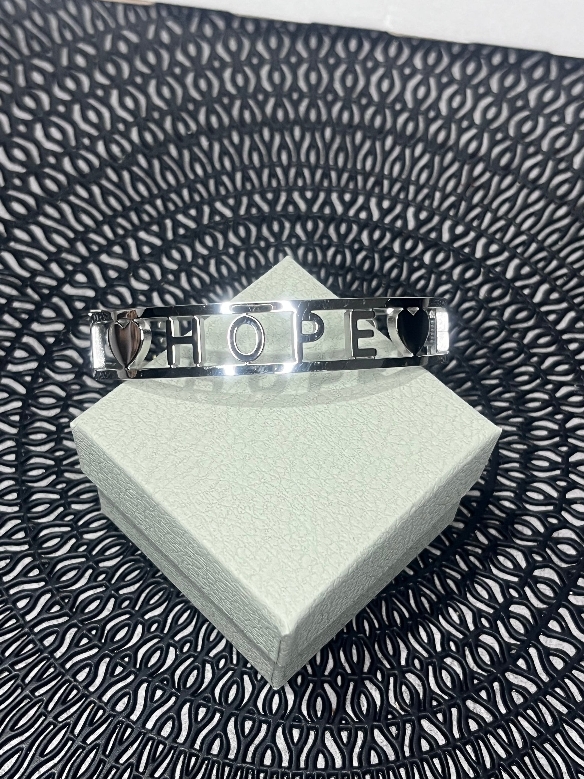 Porta con te un simbolo di positività e stile con il bracciale rigido "HOPE". Questo raffinato bangle unisce un design moderno e lineare a un messaggio profondo, rendendolo l'accessorio perfetto per chi ama i gioielli che parlano di sé.