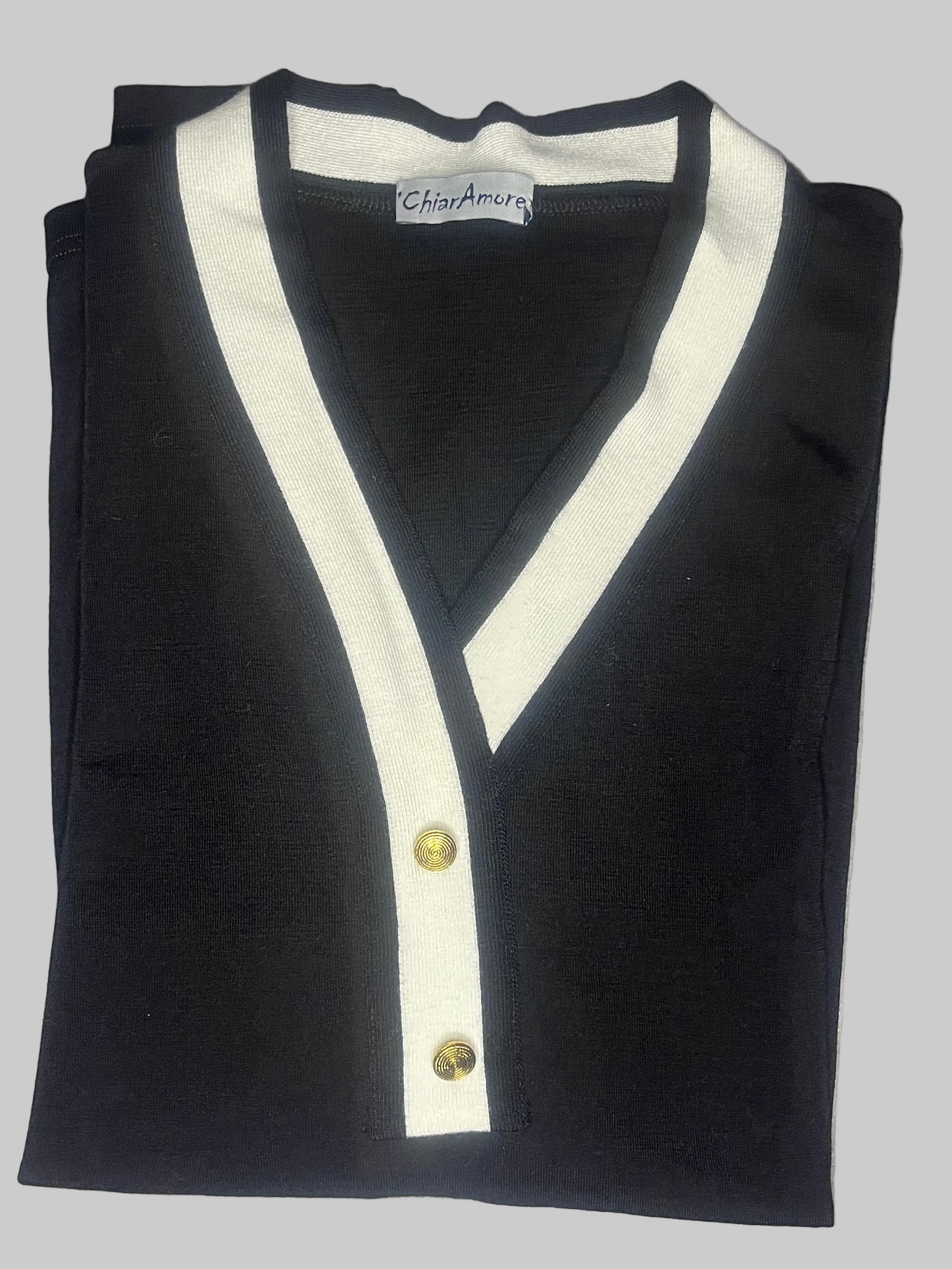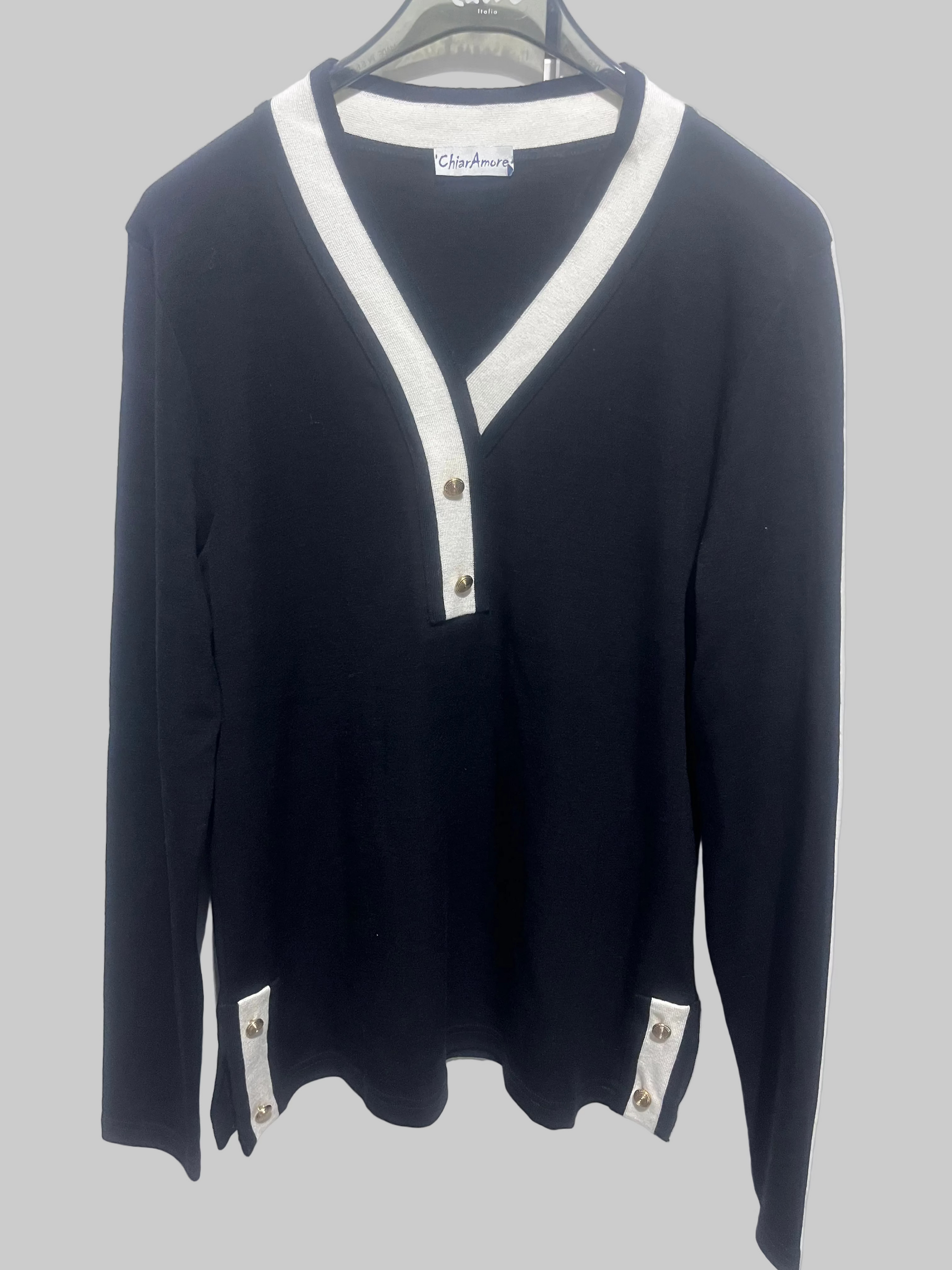 • Design a contrasto: Presenta un corpo nero con bordure bianco crema lungo lo scollo a V e i profili laterali.